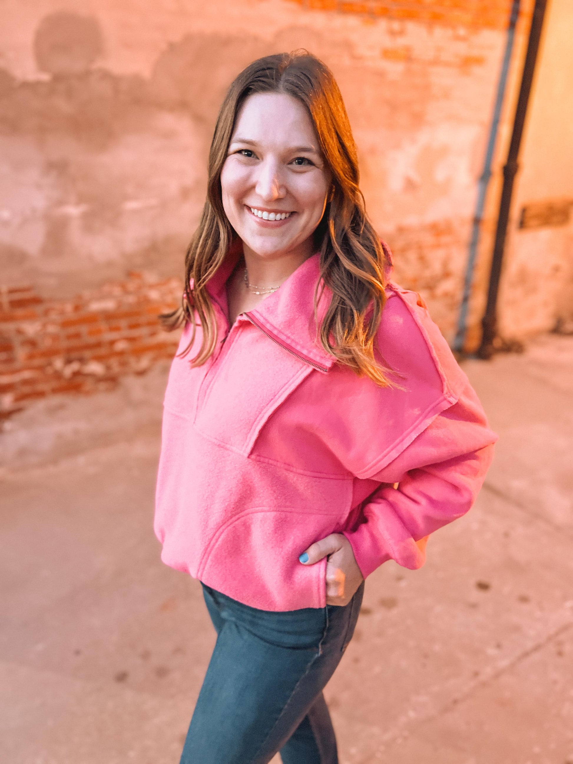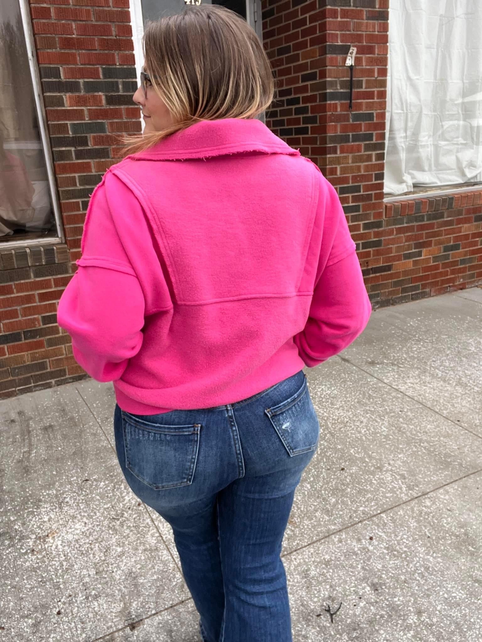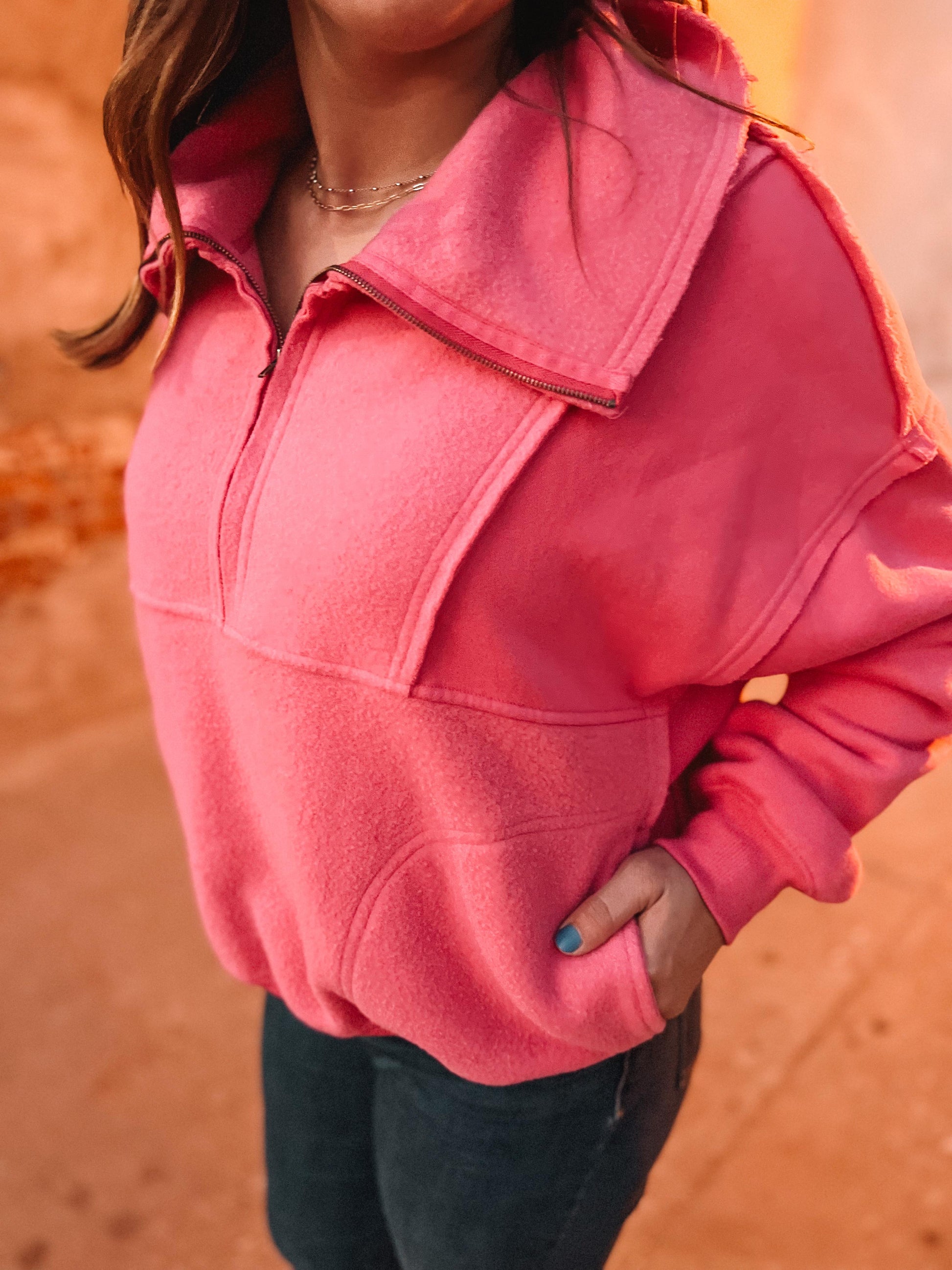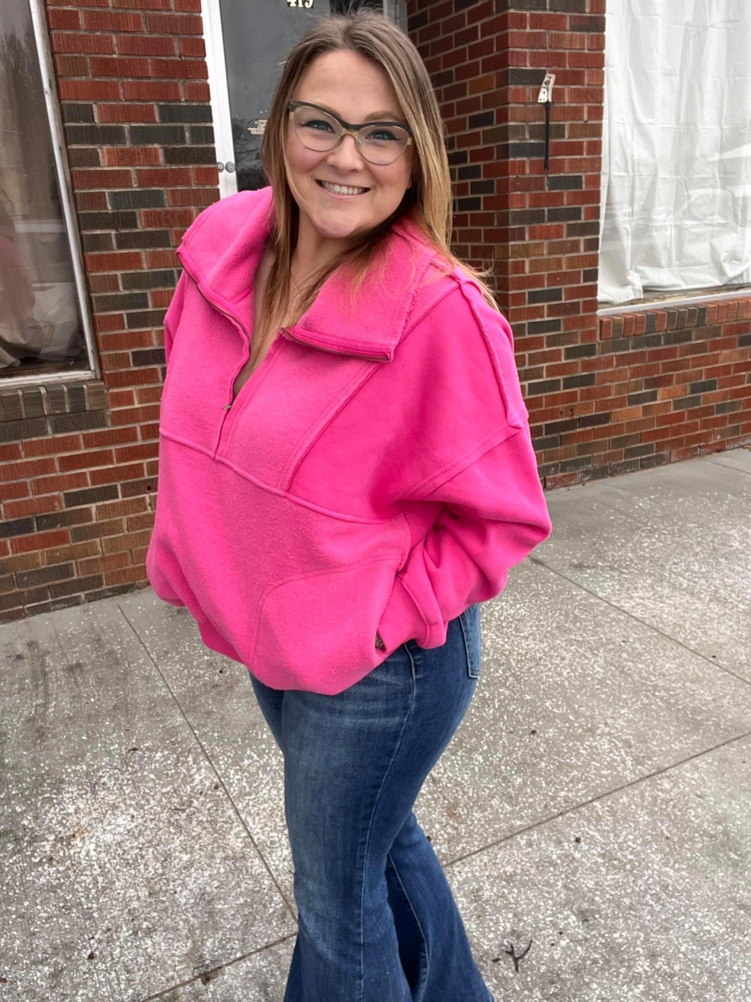 Barbie Pink relaxed fit sweatshirt featuring a zipper neckline, and front pocket. Also has ribbed cuff sleeves and hemline. Oversized fit pullover