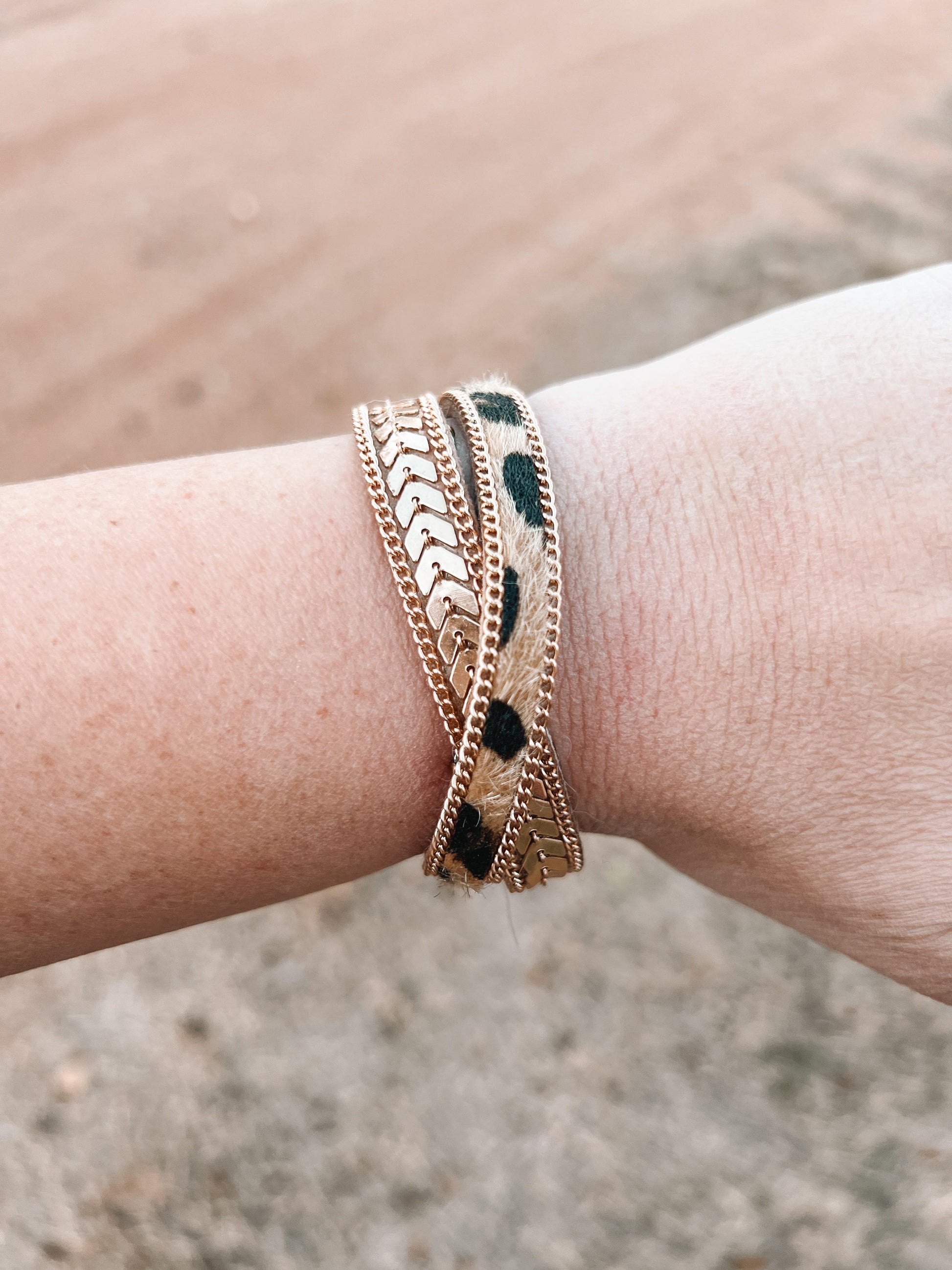 Elevate your look with the Margo Cuff. Crafted in a criss cross strap with leopard print fur, and gold detailing, this classic cuff is a must-have accessory. Experience the convenience of the magnetic clasp for a secure and stylish fit. 7.5"