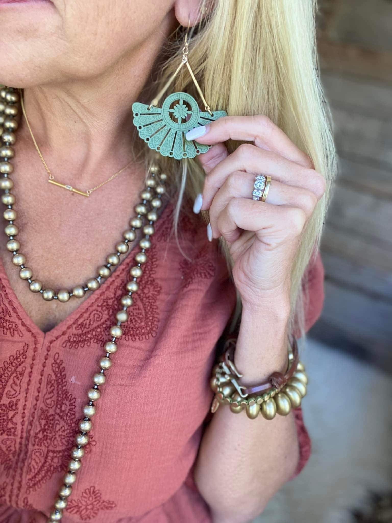 Beautiful laser cut wood earrings in green with matte gold accents! Lightweight!