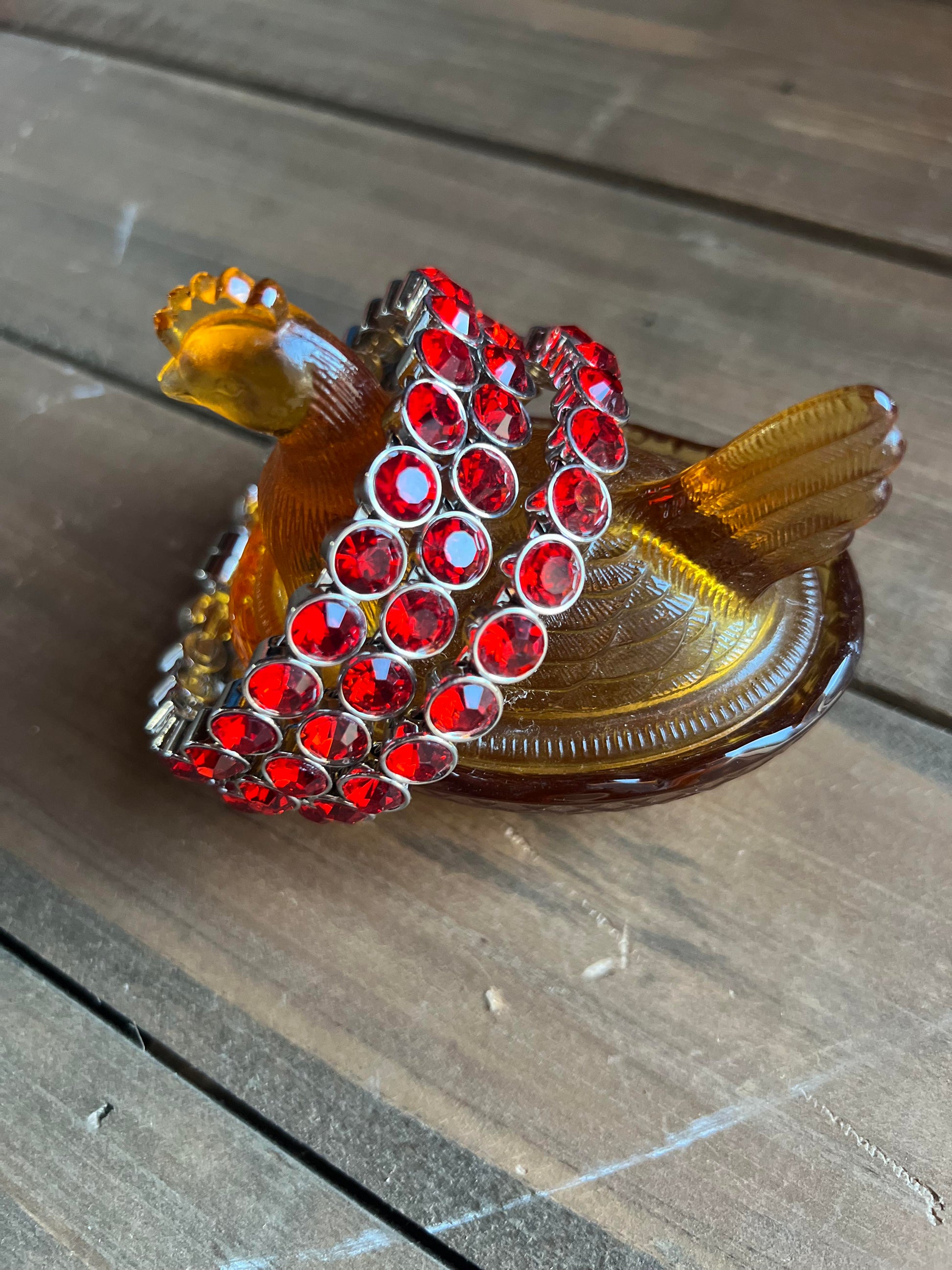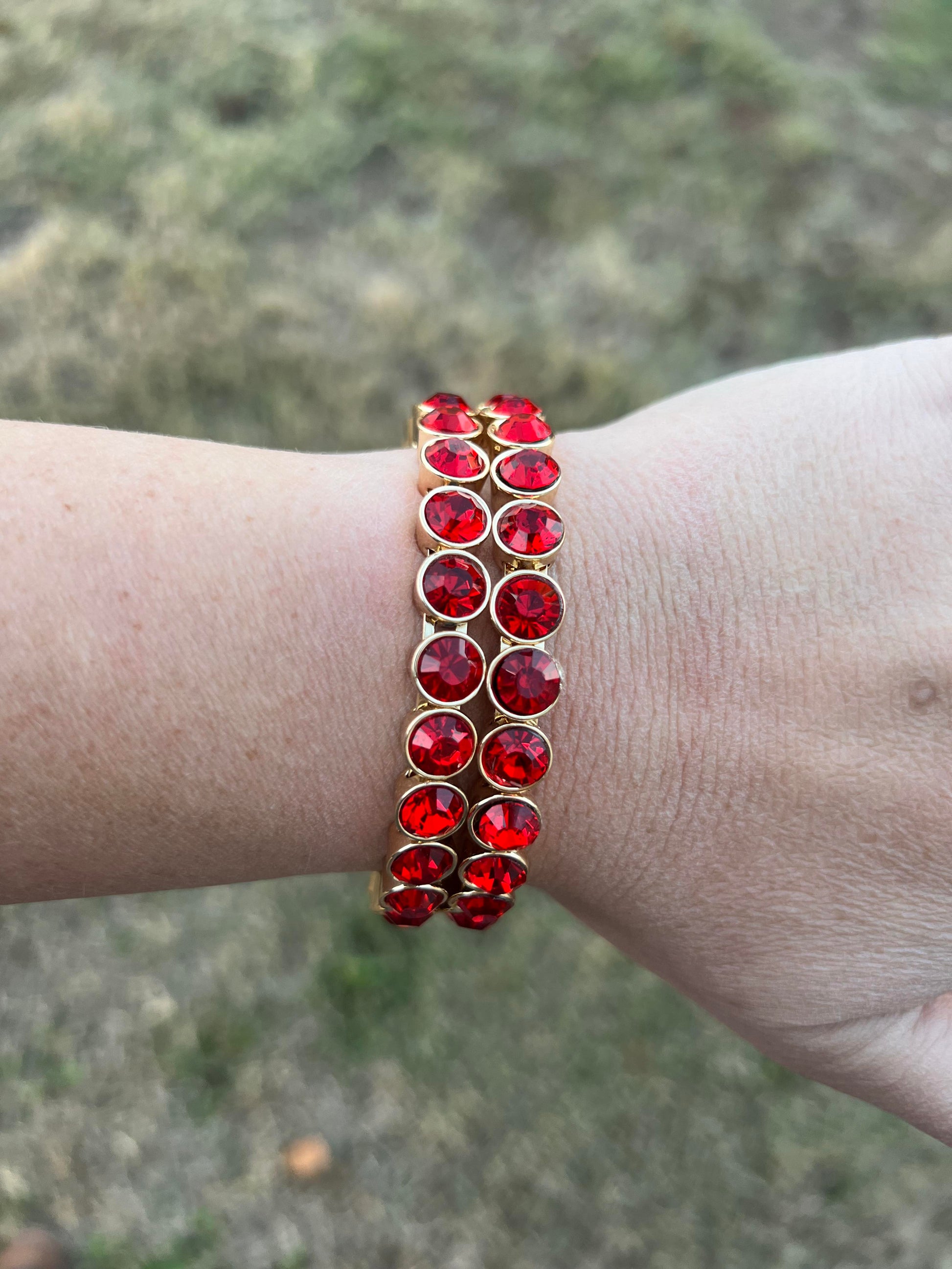 These bright red rhinestone bangles are magnetic so they are easy to get off and on! Perfect for supporting your favorite team, or through several holidays!